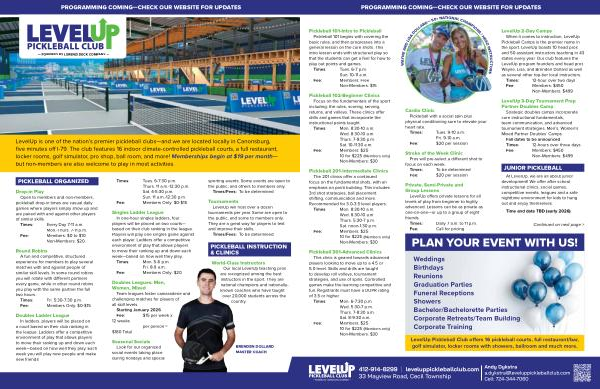 412-914-8299 | leveluppickleballclub. com 33 Mayview Road, Cecil Township