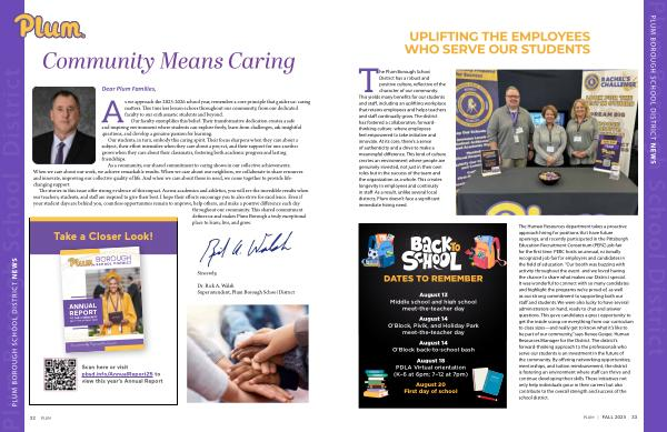 The stories in this issue offer strong evidence of this impact. Across academics and athletics, you will see the incredible results when our teachers, students, and staff are inspired to give their best. I hope their efforts encourage you to also strive for excellence. Even if your student days are behind you, countless opportunities remain to improve, help others, and make a positive difference each day throughout our community. This shared commitment defines us and makes Plum Borough a truly exceptional place to learn, live, and grow.