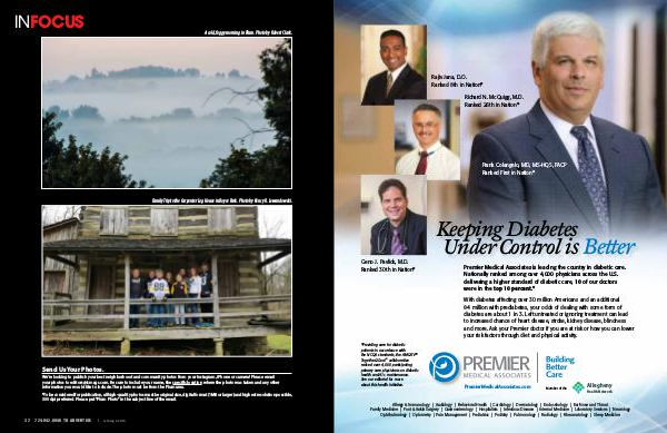 Rajiv Jana, D.O. Ranked 8th in Nation* Richard N. McQuigg, M.D. Ranked 26th in Nation* Frank Colangelo, MD, MS-HQS, FACP Ranked First in Nation* Geno J. Pavlick, M.D. Ranked 30th in Nation* Keeping Diabetes Under Control is Better Premier Medical Associates is leading the country in diabetic care. Nationally ranked among over 4,000 physicians across the U.S. delivering a higher standard of diabetic care, 10 of our doctors were in the top 10 percent.* With diabetes affecting over 30 million Americans and an additional 84 million with prediabetes, your odds of dealing with some form of diabetes are about 1 in 3. Left untreated or ignoring treatment can lead to increased chance of heart disease, stroke, kidney disease, blindness and more. Ask your Premier doctor if you are at risk or how you can lower your risk factors through diet and physical activity. *Providing care for diabetic patients in accordance with the NCQA standards, the AMGA’s™ Together2Goal ® collaborative ranked over 4,000 participating primary care physicians on diabetic health and A1c maintenance. See our editorial for more about this health initiative. PremierMedicalAssociates.com Member of the Allegheny Health Network PremierMedicalAssociates.com Allergy & Immunology | Audiology | Behavioral Health | Cardiology | Dermatology | Endocrinology | Ear Nose and Throat Family Medicine | Foot & Ankle Surgery | Gastroenterology | Hospitalists | Infectious Disease | Internal Medicine | Laboratory Services | Neurology Ophthalmology | Optometry | Pain Management | Pediatrics | Podiatry | Pulmonology | Radiology | Rheumatology | Sleep Medicine