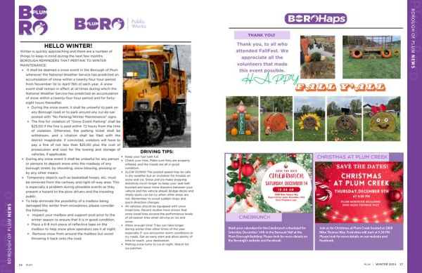 Mark your calendars for the Cinebrunch scheduled for Saturday , December 14th in the Banquet Hall at the Plum Borough Building . Please look for more details on the Borough ’ s website and Facebook .