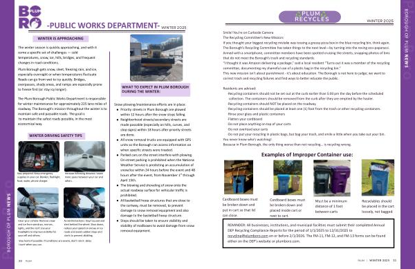 REMINDER: All businesses, institutions, and municipal facilities must submit their completed Annual DEP Recycling Compliance Reports for the period of 1 / 1 / 2025 to 12 / 31 / 2025 to recycling @ plumboro. com on or before 2 / 1 / 2026. The FM-11, FM-12, and FM-13 forms can be found either on the DEP’ s website or plumboro. com.