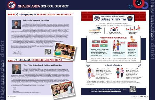 Based on community feedback, this plan prioritizes keeping Burchfield, Marzolf, Reserve, and Scott Primary Schools as K – 5 neighborhood elementary schools while fully aligning programming at Shaler Area Middle School to serve Grades 6 – 8. This means at the end of our current 2025-2026 school year no students will transition to Shaler Area Elementary School. Instead, rising 4th-grade students will remain in their neighborhood schools for 2026-2027. Then, in August 2027, rising 6th and 7th grade students will begin transitioning directly to Shaler Area Middle School, which will fully serve Grades 6 – 8. This phased approach helps ensure a smooth transition for students and families while allowing the district sufficient time to plan intentionally for optimal programming, staffing, and facility use. You can stay up-to-date with the latest developments in our facility upgrade plan by visiting bit. ly / buildingfortomorrowSASD We are thrilled to be embarking on this student-focused journey of building for tomorrow, and we welcome community feedback as this plan progresses. As always, student safety and stability are our top priorities, and we will do all we can to ensure minimal disruption and maximum collaboration during this process. I hope you are as excited as we are to see our schools evolve into facilities that are designed to best support the future of learning for every Titan.