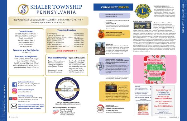 Shaler Township’ s“ Lite” Up Night Saturday, November 22 from 4:00 to 8:00pm Shaler Area Middle School and the Shaler North Hills Library Check our website and Facebook page for a full schedule featuring carriage rides, ice skating, photo booth, face painting, balloon artist, DJ Rick Wirth, magician, hair tinsel, and more. Plus Santa, Mrs. Claus, and all of the holiday characters!