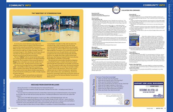 Sharps Hill would like to thank our members, the Township, and residents for their support over the last 95 years. We don’ t know what the future holds but can guarantee there will always be fire protection for the residents of our district. Like all of the other departments in Shaler, we welcome members who can volunteer their time to be part of the department. You can help in many ways as a social member even if you’ re not interested in the lengthy training to be an interior firefighter. Come join your family, friends, and neighbors for our traditional Turkey Bingo held the Sunday before Thanksgiving. This year it is Sunday, November 23rd starting at 1pm. www. sharpshillvfd. org and on Facebook at Sharps Hill VFD.