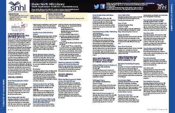 Shaler Township“ Lite-Up” Night Saturday, November 18 from 7 to 9 PM SNHL and Shaler Area Middle School Cafeteria SNHL will be open and helping to kick off the holiday season! Holiday friends will be on hand. Plus music, crafts, and refreshments. No registration needed.