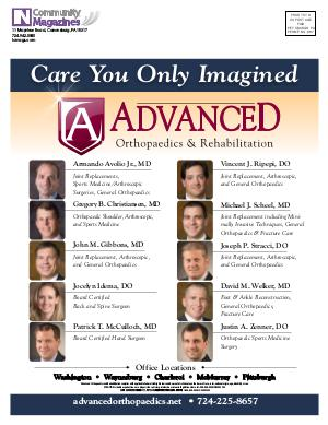 PRSRT STD US POSTAGE PAID PITTSBURGH, PA PERMIT NO. 887 11 Mayview Road, Canonsburg, PA 15317 724.942.0940 icmags.com Care You Only Imagined Armando Avolio Jr., MD Vincent J. Ripepi, DO Joint Replacements, Sports Medicine/Arthroscopic Surgeries, General Orthopaedics Joint Replacement, Arthroscopic, and General Orthopaedics Gregory B. Christiansen, MD Michael J. Scheel, MD Orthopaedic Shoulder, Arthroscopic, and Sports Medicine Joint Replacement including Mini- mally Invasive Techniques, General Orthopaedics & Fracture Care John M. Gibbons, MD Joseph P. Stracci, DO Joint Replacement, Arthroscopic, and General Orthopaedics Joint Replacement, Arthroscopic, and General Orthopaedics Jocelyn Idema, DO David M. Welker, MD Board Certified Back and Spine Surgeon Foot & Ankle Reconstruction, General Orthopaedics, Fracture Care Patrick T. McCulloch, MD Justin A. Zenner, DO Board Certified Hand Surgeon Orthopaedic Sports Medicine Surgery • Office Locations • Washington • Waynesburg • Charleroi • McMurray • Pittsburgh Advanced Orthopaedics and Rehabilitation complies with applicable Federal civil rights laws and does not discriminate on the bases of race, color, national origin, age, disability or sex. ATENCIÓN: si habla español, tiene a su disposición servicios gratuitos de asistencia lingüística. Llame al 1-888-808-9008 ID 22593393 注意:如果 使用繁體中文, 可以免費獲得語言援助服務。請致電 1-888-808-9008 ID 22593393 advancedorthopaedics.net • 724-225-8657