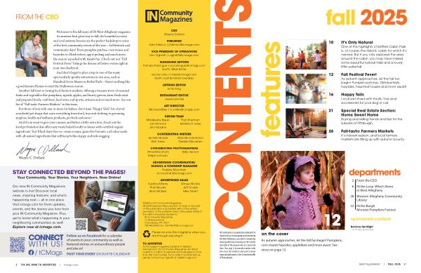 Welcome to the fall issue of IN West Allegheny magazine. As summer heat gives way to fall, the beautiful scenery and cool autumn breezes are the perfect backdrop to some of the best community events of the year— fall festivals and community days! From pumpkin patches, corn mazes and hayrides to Oktoberfests, apple picking and much more, the season is packed with family fun. Check out our“ Fall Festival Fever” listings for dozens of festive events right in your own backyard.