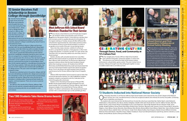 On Thursday, December 19, 59 Thomas Jefferson High School Students were inducted into the school’ s chapter of the National Honor Society. Since 1921, the National Honor Society has recognized students who embody the society’ s four pillars: scholarship, service, leadership, and character. The students who were inducted into the National Honor Society this school year were Rylan Barr, Kaitlyn Beach, Justin Berberich, Adalina Bracco, Alayna Button, Kaci Byrne, Andrew Callaghan, Isabelle Ciletti, Kylin Duell, Dominic Fascetti, Addison Fenlock, Ally Feth, Nathan Florian, Sarah Garrard, Mason Grilli, Madeline Gula, Corey Haberman, Gianna Hall, Elizabeth Hansen, Brayden Hinkle, Sylvia Kashak, Abigail Kauffman, Darsan Kharel, Kylie Killian, Bradyn Koett, Tyla Kynor, Maxwell Leidy, Cameron Lorenzi, Gianna Machi, Samantha Maglicco, Gavin Mahan, Kamryn Marcinko, Daniel Matusz, Riley McCabe, Marissa Miller, Emery Molnar, Natalie Narr, Liberty Neeley, Enrique Ochoa, Hannah Oleyar, Isabelle Ondo, Colin Pearson, Tucker Porter, Manju Pradhan, Ryan Rosgone, Natalie Schanck, William Schneider, Mckenna Shaw, Noah Skalos, Samantha Strope, Addison Tuladzieck, Chase Turk, Michael Verbanick, Isaiah Vinay, Dominic Volomino, Cecelia Wessel, Samuel Wessel, Quenne Zheng, and Alivia Zulka. est Jefferson Hills WEST JEFFERSON HILLS SCHOOL DISTRICT NEWS— THOMAS JEFFERSON HIGH SCHOOL