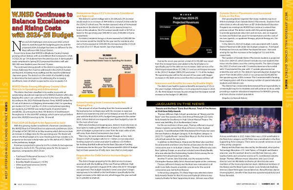 New and old challenges exist every year when school districts work through the budgeting process and the proposed 2024-25 budget has been no different for the West Jefferson Hills School District . Recent data shows that WJHSD is Allegheny County ’ s fastestgrowing school district , with an enrollment that increased to 3,426 in 2023-24 , up 134 students from the previous year . A demographic study completed in Spring 2023 projected the district will add 400 – 500 new students over the next 10 years .