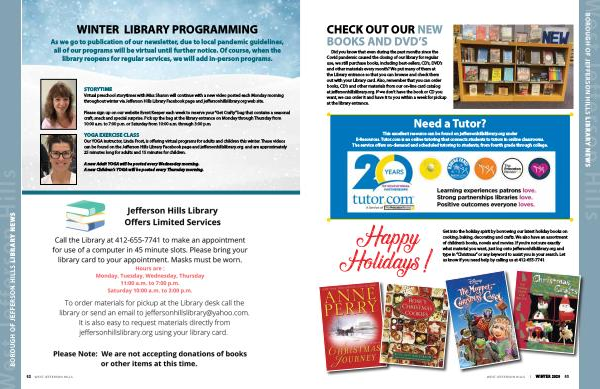 Get into the holiday spirit by borrowing our latest holiday books on cooking , baking , decorating and crafts . We also have an assortment of children ’ s books , novels and movies . If you ’ re not sure exactly what material you want , just log onto jeffersonhillslibrary . org and type in “ Christmas ” or any keyword to assist you in your search . Let us know if you need help by calling us at 412-655-7741 . est Jefferson Hills BOROUGH OF JEFFERSON HILLS LIBRARY NEWS