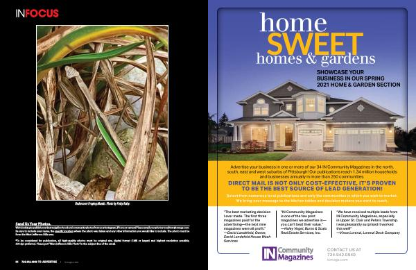 Advertise your business in one or more of our 34 IN Community Magazines in the north , south , east and west suburbs of Pittsburgh ! Our publications reach 1.34 million households and businesses annually in more than 250 communities . DIRECT MAIL IS NOT ONLY COST-EFFECTIVE , IT ’ S PROVEN TO BE THE BEST SOURCE OF LEAD GENERATION !