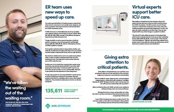 When Jefferson Hospital doctors first adopted a Virtual ICU system last year , they had no idea how vital it would be during the COVID-19 pandemic . The VICU monitors at each ICU bed connect to a remote team of intensive care nurses , and boardcertified specialists use sophisticated equipment to monitor vital signs , lab results , medications , and other data . They can alert hospital staff to any critical changes in a patient ’ s condition .