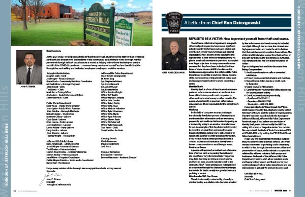 As the 2021 ends , I would personally like to thank the Borough of Jefferson Hills staff for their continued hard work and dedication to the residents of this community . Each member of the Borough staff has persevered through difficult circumstances as varied as helping onboard new leadership to the rise and fall of the COVID-19 pandemic . I commend every member of our staff and am thankful that the Borough has such willing and dedicated employees to rely upon to deliver services . est Jefferson Hills BOROUGH OF JEFFERSON HILLS NEWS