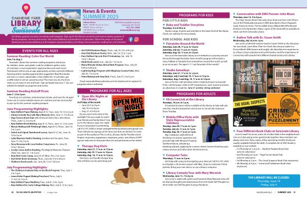 Check swissvale. librarycalendar. com for details and to register for programs where indicated.