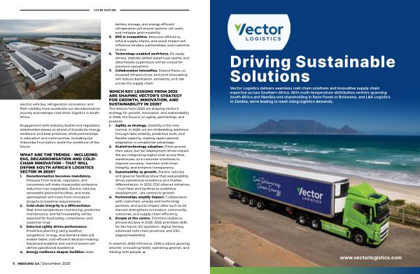 Vector Logistics delivers seamless cold chain solutions and innovative supply chain expertise across Southern Africa. With multi-temperature distribution centres spanning South Africa and Namibia and shareholding in Senn Foods in Botswana, and L & A Logistics in Zambia, we’ re leading to meet rising logistics demands. www. vectorlogistics. com