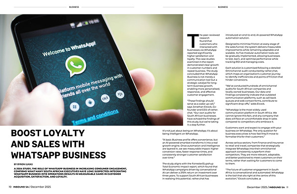 A 2024 STUDY, THE ROLE OF WHATSAPP BUSINESS IN INCREASING CONSUMER ENGAGEMENT, CONFIRMS WHAT MANY SOUTH AFRICAN EXECUTIVES HAVE LONG SUSPECTED: INTEGRATING WHATSAPP BUSINESS INTO OPERATIONS RESULTS IN MEASURABLE GAINS IN CUSTOMER ACQUISITION, SATISFACTION, AND LOYALTY.