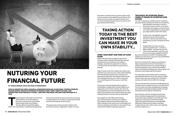 EVEN IN UNCERTAIN TIMES, FINANCIAL CONFIDENCE REMAINS ACHIEVABLE. THERESE GROBLER SHARES SIMPLE, PROVEN STRATEGIES TO REDUCE COSTLY DEBT, BOOST SAVINGS, AND STRENGTHEN YOUR FINANCIAL FUTURE – ONE STEP, ONE RAND, AND ONE WISE DECISION AT A TIME.