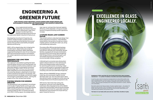 With its Four-Star Green Star rating and recognition as Runner-Up for Best Quality Submission( New Developments) at the GBCSA Leadership Awards 2025, Arterial Industrial Estate stands as a benchmark for sustainable industrial development and a blueprint for South Africa’ s green industrial future. IB