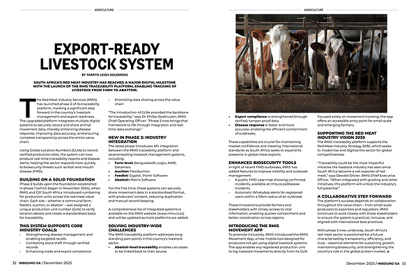 SOUTH AFRICA’ S RED MEAT INDUSTRY HAS REACHED A MAJOR DIGITAL MILESTONE WITH THE LAUNCH OF THE RMIS TRACEABILITY PLATFORM, ENABLING TRACKING OF LIVESTOCK FROM FARM TO ABATTOIR.