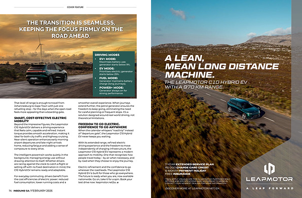 Electric refinement and the confidence to go wherever the road leads. The Leapmotor C10 Hybrid EV is built for those who go everywhere. The future is ready when you are, now available nationwide. Go on, take it for a spin. Book your test drive now: leapmotor. net / za. IB