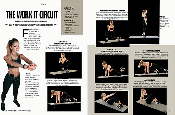 MOUNTAIN CLIMBERS Begin in a high plank with shoulders stacked over wrists, drive knees alternately toward your chest at a quick pace, keeping hips low, core tight, and breathing steady throughout.