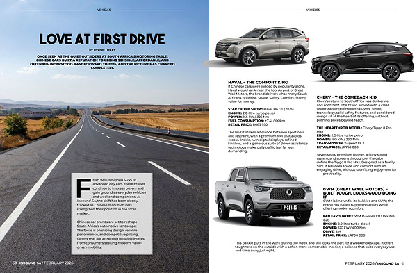 ONCE SEEN AS THE QUIET OUTSIDERS AT SOUTH AFRICA’ S MOTORING TABLE, CHINESE CARS BUILT A REPUTATION FOR BEING SENSIBLE, AFFORDABLE, AND OFTEN MISUNDERSTOOD. FAST FORWARD TO 2026, AND THE PICTURE HAS CHANGED COMPLETELY.