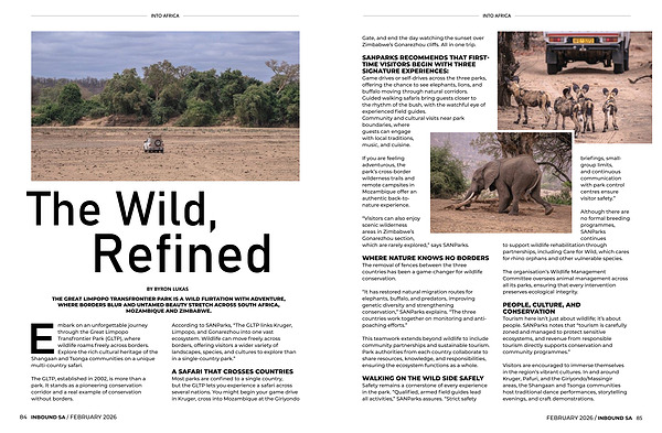 THE GREAT LIMPOPO TRANSFRONTIER PARK IS A WILD FLIRTATION WITH ADVENTURE, WHERE BORDERS BLUR AND UNTAMED BEAUTY STRETCH ACROSS SOUTH AFRICA, MOZAMBIQUE AND ZIMBABWE.