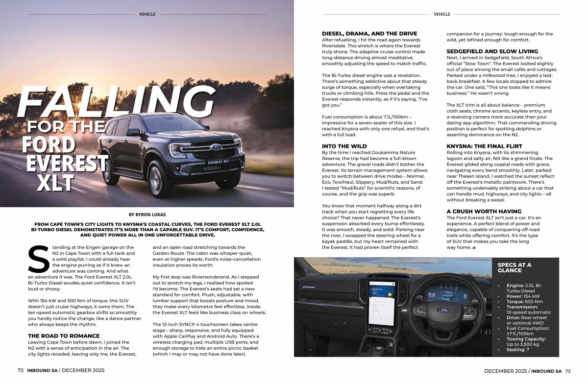 Rolling into Knysna, with its shimmering lagoon and salty air, felt like a grand finale. The Everest glided along coastal roads with grace, navigating every bend smoothly. Later, parked near Thesen Island, I watched the sunset reflect off the Everest’ s metallic paintwork. There’ s something undeniably striking about a car that can handle mud, highways, and city lights – all without breaking a sweat.