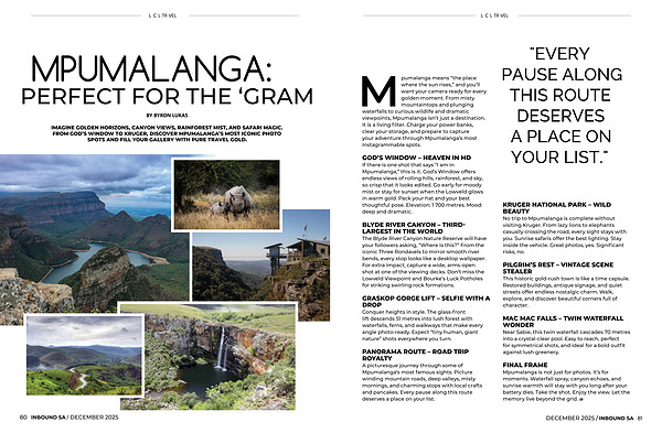 IMAGINE GOLDEN HORIZONS, CANYON VIEWS, RAINFOREST MIST, AND SAFARI MAGIC. FROM GOD’ S WINDOW TO KRUGER, DISCOVER MPUMALANGA’ S MOST ICONIC PHOTO SPOTS AND FILL YOUR GALLERY WITH PURE TRAVEL GOLD.