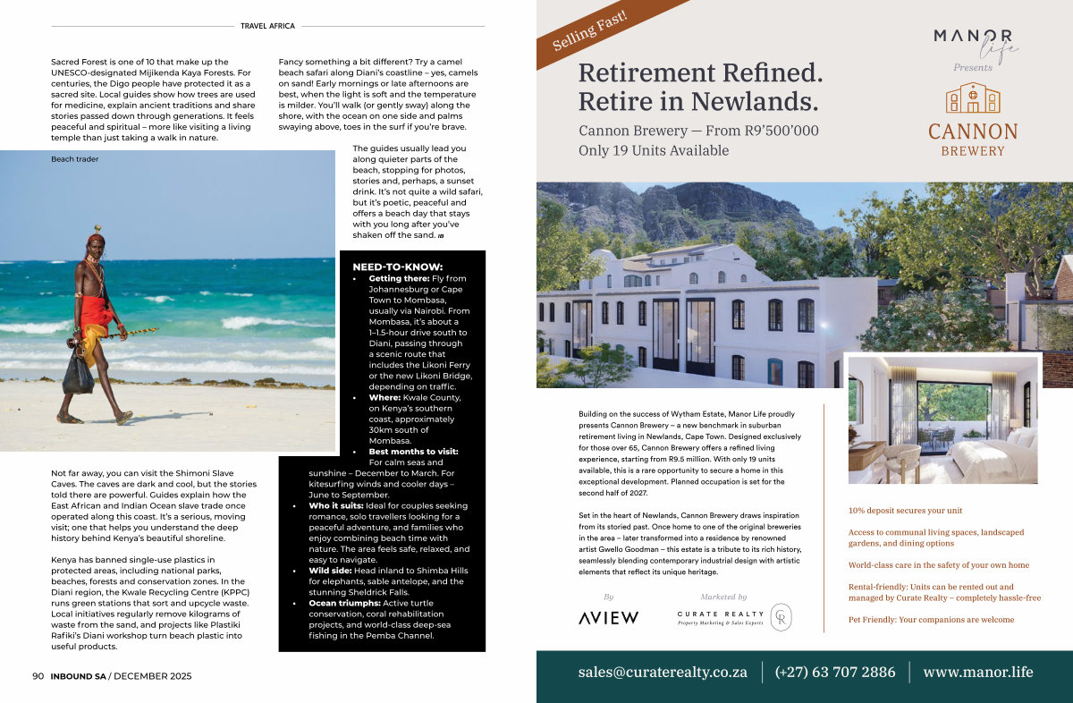 • Getting there: Fly from Johannesburg or Cape Town to Mombasa, usually via Nairobi. From Mombasa, it’ s about a 1 – 1.5-hour drive south to Diani, passing through a scenic route that includes the Likoni Ferry or the new Likoni Bridge, depending on traffic.