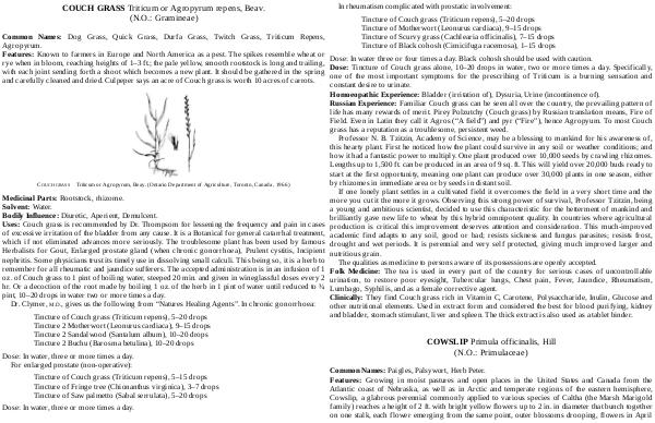 Medicinal Parts: Rootstock, rhizome. Solvent: Water. Bodily Influence: Diuretic, Aperient, Demulcent. Uses: Couch grass is recommended by Dr. Thompsom for lessening the frequency and pain in cases of excessive irritation of the bladder from any cause. It is a Botanical for general catarrhal treatment, which if not eliminated advances more seriously. The troublesome plant has been used by famous Herbalists for Gout, Enlarged prostate gland( when chronic gonorrhoea), Prulent cystitis, Incipient nephritis. Some physicians trust its timely use in dissolving small calculi. This being so, it is a herb to remember for all rheumatic and jaundice sufferers. The accepted administration is in an infusion of 1 oz. of Couch grass to 1 pint of boiling water, steeped 20 min. and given in wineglassful doses every 2 hr. Or a decoction of the root made by boiling 1 oz. of the herb in 1 pint of water until reduced to ¾ pint, 10 – 20 drops in water two or more times a day.