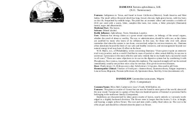 W. H. Myers, M. D., of Philadelphia, writes concerning Damiana:“ I have given it quite an extensive trial in my practice, and as a result I find that in cases of partial or other sexual debility, its success is universal. I pronounce it the most effective and only remedy that in my hands had a successful result in all cases.” There are some objections to its use on the digestive system but by combining it with Phosphorus, Nux vomica, it partially obviates this tendency. The required strength will not be noticed immediately; usually one portion once a day for ten days. Also given in nervous diseases. Dose: Fluid extract, 15 – 30 drops once a day. Solid extract, 3 – 6 grains. Also used in pill form. Homoeopathic Clinical: Tincture of fresh part— Amenorrhoea, Dysmenorrhoea, Fatigue impotence, Leucorrhoea, Migraine, Prostate( affections of), Spermatorrhoea, Sterility, Urine( incontinence of).