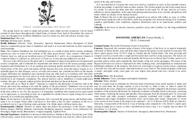 J. Kloss tells us in“ Back to Eden”:“ Anaemia is caused by the deficiency of nutritive salts in the blood, and really has nothing to do with the quality of the good blood.” Dandelion root cut up and dried is used for coffee by health-minded people. From a health point of view, it is more desirable to drink than coffee or tea. For this purpose it is frequently combined with roasted acorns and roasted rye in equal parts, or according to taste. As a vegetable for salads it has no equal, being rich in many minerals. It is a medicinal vegetable plant. Dose: Of the tincture 5 – 40 drops. For infusions, fill a cup with the green leaves, add boiling water, steep ½ hr. or longer. Drink when cold, three or four times a day. Or add 1 teaspoon of the cut or powdered root to 1 cup of boiling water and steep ½ hr. Drink when cold three times a day. Homoeopathic Clinical: Tincture of whole plant just before the perfection of the flower— Ague, Bilious attacks, Debility, Diabetes, Gall-stones, Headaches( gastric), Jaundice, Liver( affections of), Neuralgia, Night-sweats, Rheumatism, Tongue( mapped), Typhoid fever. Russian Experience: Dandelion is known as Oduvanchik or Pushki in Russia. Taraxacum, part of the official name, comes from Greece, and in ancient time Taraxacum was used for yellow spots( liver
