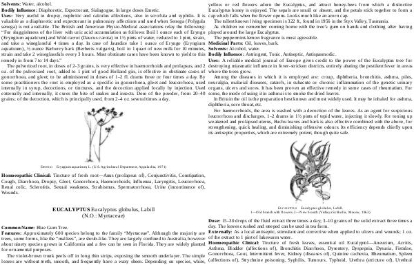 Dose: 15 – 30 drops of the fluid extract three times a day; 3 – 10 grains of the solid extract three times a day. The leaves crushed and steeped can be used in tea form. Externally: As a local antiseptic, stimulant and corrective when applied to ulcers and wounds; 1 oz. of the extract to 1 pint of lukewarm water. Homoeopathic Clinical: Tincture of fresh leaves, essential oil Eucalyptol— Aneurism, Acritis, Asthma, Bladder( affections of), Bronchitis Diarrhoea, Dysentery, Dyspepsia, Dysuria, Fistulae, Gonorrhoea, Gout, Intermittent fever, Kidney( diseases of), Quinine cachexia, Rheumatism, Spleen( affections of), Strychnine poisoning, Syphilis, Tumours, Typhoid, Urethra( stricture of), Urethral