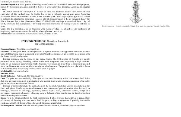 carbuncle, Varicose ulcers, Worms. Russian Experience: Two species of Eucalyptus are cultivated for medical and decorative purposes, known by the same name, pronounced in their own way, Eucalyptus globulus, Labill and Eucalyptus cinera. Dr. Ramel introduced Eucalyptus to Europe in 1856 and Southern France soon followed with cultivation of this medical tree. Dr. Muller has written a valuable monography about Australian Eucalyptus which has stimulated interest in this valuable plant. About eighty years ago Russia started to cultivate Eucalyptus for decorative reasons; later its interest was of a deeper meaning. Today the Black Sea area has active plantations. About 15,000 – 18,000 seedlings are obtained from 1 kg. of seeds, which are then transplanted. The young trees yield leaves for oil extract, or are cut and used as a tea. Uses: The tea, decoctions, oil or Nastoika with Russian vodka is on hand for all conditions of respiratory malfunctions: colds, bronchitis, chest tightness, catarrh, etc. Externally: Skin conditions of carbuncles, boils, wounds, ulcers.