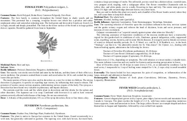 Bees are said to dislike this plant very much, and a handful of the flower heads carried, where they are, will cause them to keep their distance. Medicinal Part: The whole herb. Solvents: Alcohol, boiling water( partially). Bodily Influence: Aperient, Carminative, Tonic Emmenagogue, Vermifuge, Stimulant. Uses: The warming infusion of Feverfew upon the circulation influences the skin, nervous system and the genito urinary organs and relieves the head of dizziness, brain and nerve pressure, and tensions of over-excitement. Culpeper recommends it as“ a special remedy against opium when taken too liberally”. The relieving assistance of hyperemic conditions of the mucous membrane have a trustworthy regard for this garden herb in conditions of colic, flatulence, general indigestion, colds, suppressed urine, expelling, worms, hysteria, and in some febrile diseases. It is largely used in female correction of scanty or delayed monthly periods. Dr. G. P. Wood, M. D., and Dr. E. H. Ruddock, M. D., in the book“ Vitalogy”, say that it is“ An admirable remedy for St. Vitus dance”. Dr. Clymer. M. D., dealing with Natures healing agents, administers the following for fevers: