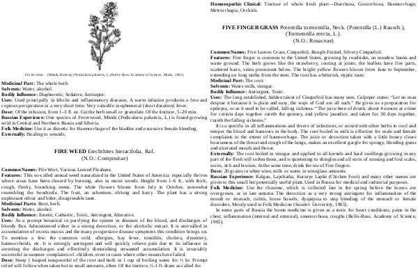 It is a specific in all inflammations and fevers of infections, or mixed with other herbs to cool and temper the blood and humours in the body. The root boiled in milk is effective for male and female complaints to the extent of haemorrhage. The juice or decoction taken with a little honey clears hoarseness of the throat and cough of the lungs, makes an excellent gargle for spongy, bleeding gums and ulcerated mouth and throat. Externally: The root boiled in vinegar and applied to all kernels and hard swellings growing in any part of the flesh will soften them, and is quietening to shingles and all sorts of running and foul scabs, sores, itch and bruises. At the same time, drink the tea of Five fingers. Dose: 20 grains in white wine, milk or water in wineglass amounts. Russian Experience: Kalgan, Lapchatka, Kurinye Lapke( Chicken Foot) and many other names are given to this small but potentially useful plant. Used in Russia for medical and industrial purposes. Folk Medicine: Use the rhizome, which is collected late in the spring before the leaves are overgrown, or in late autumn. The decoction as a very strong astringent for inflammation of the mouth or stomach, colitis, loose bowels, dyspepsia to stop bleeding of the stomach or female disorders. Mostly used in Folk Medicine( Saratov University, 1965).
