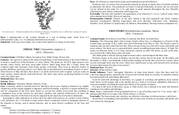 In bilious colic it is best to first evacuate the stomach by giving an emetic dose of Lobelia and then to administer the above. The powdered root bark is used professionally; however, the cut root bark can be infused in hot water for ½ hr. and taken in small amounts throughout the day. Pulsatilla( Anemone) is also used in conjunction with Fringe tree. Externally: The skin will respond to the application of an infusion of 1 oz. to 1 pint of water, when other attempts have failed. Also as an injection. Homoeopathic Clinical: Tincture of the bark( which is the part employed and which contains saponin)— Constipation, Debility, Emaciation with liver disorder, Gall-stone colic, Headache, Jaundice, Liver( disease of, hypertrophy of), Malaria, Neurasthenia, Nursing women( complaints of).