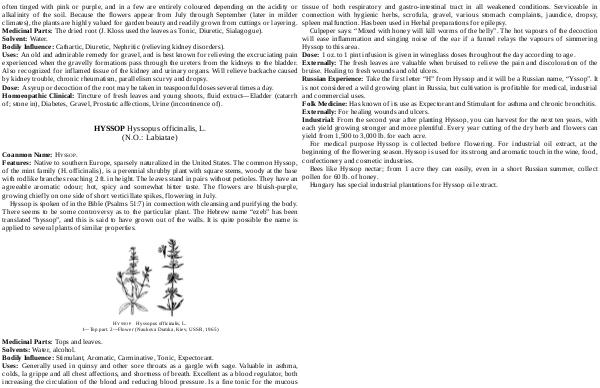 Culpeper says:“ Mixed with honey will kill worms of the belly”. The hot vapours of the decoction will ease inflammation and singing noise of the ear if a funnel relays the vapours of simmering Hyssop to this area. Dose: 1 oz. to 1 pint infusion is given in wineglass doses throughout the day according to age. Externally: The fresh leaves are valuable when bruised to relieve the pain and discoloration of the bruise. Healing to fresh wounds and old ulcers. Russian Experience: Take the first letter“ H” from Hyssop and it will be a Russian name,“ Yssop”. It is not considered a wild growing plant in Russia, but cultivation is profitable for medical, industrial and commercial uses. Folk Medicine: Has known of its use as Expectorant and Stimulant for asthma and chronic bronchitis. Externally: For healing wounds and ulcers. Industrial: From the second year after planting Hyssop, you can harvest for the next ten years, with each yield growing stronger and more plentiful. Every year cutting of the dry herb and flowers can yield from 1,500 to 3,000 lb. for each acre.