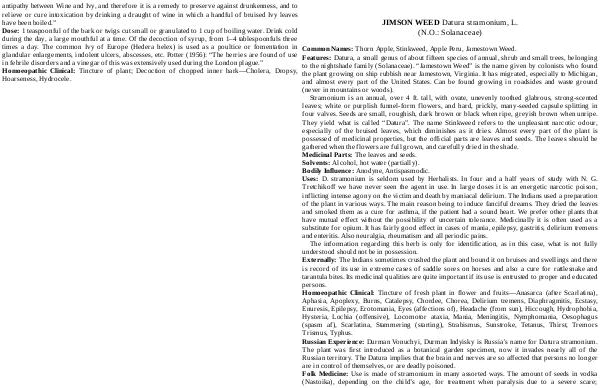 The information regarding this herb is only for identification, as in this case, what is not fully understood should not be in possession. Externally: The Indians sometimes crushed the plant and bound it on bruises and swellings and there is record of its use in extreme cases of saddle sores on horses and also a cure for rattlesnake and tarantula bites. Its medicinal qualities are quite important if its use is entrusted to proper and educated persons. Homoeopathic Clinical: Tincture of fresh plant in flower and fruits— Anasarca( after Scarlatina), Aphasia, Apoplexy, Burns, Catalepsy, Chordee, Chorea, Delirium tremens, Diaphragmitis, Ecstasy, Enuresis, Epilepsy, Erotomania, Eyes( affections of), Headache( from sun), Hiccough, Hydrophobia, Hysteria, Lochia( offensive), Locomotor ataxia, Mania, Meningitis, Nymphomania, Oesophagus( spasm af), Scarlatina, Stammering( starting), Strabismus, Sunstroke, Tetanus, Thirst, Tremors Trismus, Typhus. Russian Experience: Durman Vonuchyi, Durman Indyisky is Russia’ s name for Datura stramonium. The plant was first introduced as a botanical garden specimen, now it invades nearly all of the Russian territory. The Datura implies that the brain and nerves are so affected that persons no longer are in control of themselves, or are deadly poisoned. Folk Medicine: Use is made of stramonium in many assorted ways. The amount of seeds in vodka( Nastoika), depending on the child’ s age, for treatment when paralysis due to a severe scare;