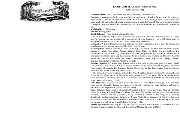 Common Names: James Tea, Marsh Tea, Wild Rosemary, Continental Tea. Features: An evergreen shrub common to North America and is found as far south as Wisconsin and Pennsylvania. They are low ornamental plants from 1 – 6 ft. high, having narrow, dark leaves lined underneath with rust-coloured wooly hairs and bearing white, bell-shaped flowers in the early spring. During the American Revolution the leaves are said to have been used as a substitute for commercial tea. Medicinal Part: The leaves. Solvent: Boiling water. Bodily Influence: Pectoral, Expectorant, Diuretic. Uses: Very useful in coughs, colds, bronchial and pulmonary affections. Sometimes used as a table tea. For internal use the infusion of 1 teaspoonful of dried leaves to 1 cup of boiling water in wineglassful doses as needed for the control of the above mentioned. Externally: A strong decoction has been recommended for external use as a remedy for itching and exanthematous( eruptions accompanied by fever) skin diseases. Homoeopathic Clinical: Tincture of dried small twigs and leaves collected after flowering begins; tincture of whole fresh plant— Ascites, Asthma, Bites, Black eye, Boils, Bruises, Deafness, Ear( inflammation of), Eczema, Erythema nodosum, Face( pimples on), Feet( pains in, tender), Gout, Haemoptysis, Hands( pains in), Intoxication, Joints( affections of, cracking in Menier’ s disease), Pediculosis, Prickly heat, Punctured wounds, Rheumatism, Skin( eruption on), Stings, Tetanus, Tinnitus, Tuberculosis, Varicella, Whitlow, Wounds. Russian Experience: The common Russian name is Bogulnik but literature gives it another, Herba Ledu, which is very close to Canadian Ledum palustra, or Ledum marshland. Bogulnik sometimes covers miles of marshland in European Russia, Siberia and the Far East, making it impossible for other plants to invade this strong shrub abode.