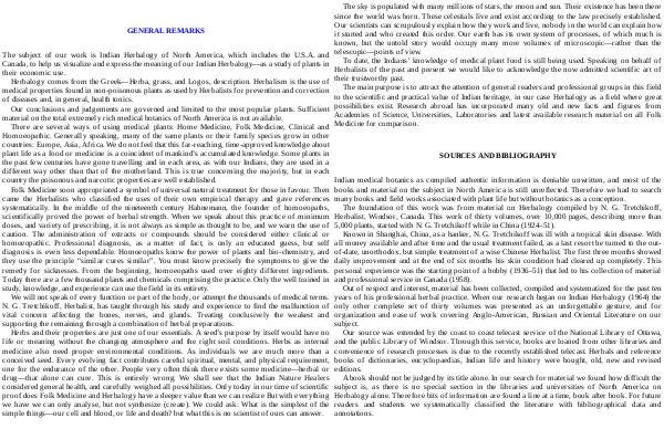 Indian medical botanics as compiled authentic information is deniable unwritten, and most of the books and material on the subject in North America is still unreflected. Therefore we had to search many books and field works associated with plant life but without botanics as a conception. The foundation of this work was from material on Herbalogy compiled by N. G. Tretchikoff, Herbalist, Windsor, Canada. This work of thirty volumes, over 10,000 pages, describing more than 5,000 plants, started with N. G. Tretchikoff while in China( 1924 – 51).