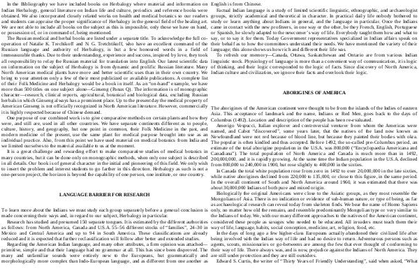 The Russian medical and herbal books are listed under a separate title. To acknowledge the full cooperation of Natalie K. Trechikoff and N. G. Tretchtikoff, who have an excellent command of the Russian language and authority of Herbalogy, is but a few honoured words in a field of immeasurable thanks. Due to their understanding, experience and success, inspired by love, they took all responsibility to relay the Russian material for translation into English. Our latest scientific data on information on the subject of Herbalogy is from dynamic and prolific Russian literature. Many North American medical plants have more and better scientific uses than in their own country. We bring to your attention only a few of their most publicized or available publications. A complete list of their Folk Medicine and Herbalogy would be a book in itself. As an“ on-hand” example, we have more than 500 titles on one subject alone— Ginseng( Panax Q). The information is of monographic character— research, clinical reports, agricultural, botanical and biological data, excluding Russian herbals in which Ginseng always has a prominent place. Up to the present day the medical property of American Ginseng is not officially recognized in North American literature. However, commercially it is highly respected because of Chinese demand.