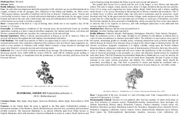 MANDRAKE, AMERICAN Podophyllum, L.( Z. A. Popov, Lekarstevennye Rastenia, Kiev, 1967)