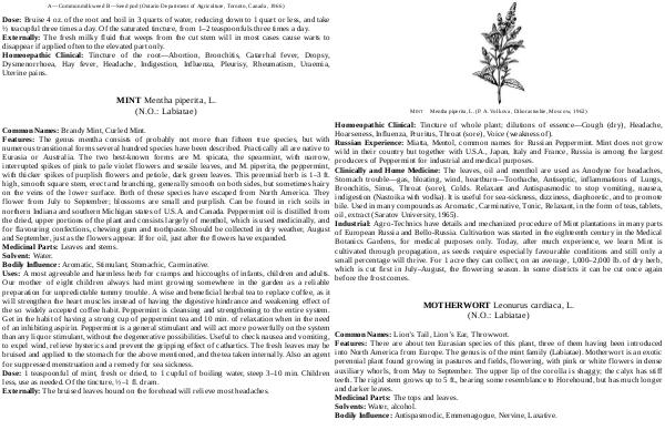 Common Names: Brandy Mint, Curled Mint. Features: The genus mentha consists of probably not more than fifteen true species, but with numerous transitional forms several hundred species have been described. Practically all are native to Eurasia or Australia. The two best-known forms are M. spicata, the spearmint, with narrow, interrupted spikes of pink to pale violet flowers and sessile leaves, and M. piperita, the peppermint, with thicker spikes of purplish flowers and petiole, dark green leaves. This perennial herb is 1 – 3 ft. high, smooth square stem, erect and branching, generally smooth on both sides, but sometimes hairy on the veins of the lower surface. Both of these species have escaped from North America. They flower from July to September; blossoms are small and purplish. Can be found in rich soils in northern Indiana and southern Michigan states of U. S. A. and Canada. Peppermint oil is distilled from the dried, upper portions of the plant and consists largely of menthol, which is used medicinally, and for flavouring confections, chewing gum and toothpaste. Should be collected in dry weather, August and September, just as the flowers appear. If for oil, just after the flowers have expanded. Medicinal Parts: Leaves and stems. Solvent: Water. Bodily Influence: Aromatic, Stimulant, Stomachic, Carminative. Uses: A most agreeable and harmless herb for cramps and hiccoughs of infants, children and adults. Our mother of eight children always had mint growing somewhere in the garden as a reliable preparation for unpredictable tummy trouble. A wise and beneficial herbal tea to replace coffee, as it will strengthen the heart muscles instead of having the digestive hindrance and weakening effect of the so widely accepted coffee habit. Peppermint is cleansing and strengthening to the entire system. Get in the habit of having a strong cup of peppermint tea and 10 min. of relaxation when in the need of an inhibiting aspirin. Peppermint is a general stimulant and will act more powerfully on the system than any liquor stimulant, without the degenerative possibilities. Useful to check nausea and vomiting, to expel wind, relieve hysterics and prevent the gripping effect of cathartics. The fresh leaves may be bruised and applied to the stomach for the above mentioned, and the tea taken internally. Also an agent for suppressed menstruation and a remedy for sea sickness. Dose: 1 teaspoonful of mint, fresh or dried, to 1 cupful of boiling water, steep 3 – 10 min. Children less, use as needed. Of the tincture, ½ – 1 fl. dram. Externally: The bruised leaves bound on the forehead will relieve most headaches.