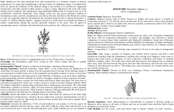 Dose: Of the decoction, from l – 2 wineglassfuls every 2 – 3 hr. Of the extract, 3 – 5 grains. Externally: Hot fomentations made from strong tea will relieve cramps and pain in painful menstruation, etc. Homoeopathic Clinical: Tincture or infusion of fresh plant— Dysentery, Haemorrhage. Russian Experience: Pustirnik Serdechny,“ Heart Herb”, is one of the names for Motherwort, of which there are many species. It seems to be the forgotten herb of Europe. In the fifteenth century it was prominent in herbal books, but in the nineteenth and twentieth centuries it seems to have been forgotten. Its popularity still holds good in Folk Medicine of Rumania as an aid to heart conditions, goitre and epilepsy and also in Britain for hysteria, neuralgia, weakness of heart, shortness of breath. Folk Medicine of Russia consider the fresh leaves and flowers better than dried. The fresh juice is extracted and prepared for winter use— 2 parts of juice to 3 parts of alcohol( Vishaya Schkola, 1963). For female complaints of amenorrhoea, dysmenorrhoea, sleeplessness, nervousness, TB of the lungs( Bello-Russ. Academy of Science, 1965). For heart neurosis, high blood pressure, goitre, epilepsy, used as a tea( Moscow University, 1963). Instead of Valerian( Valeriana officinalis) the fresh juice of leaves and flowers, 30 – 40 drops, for calming( Saratov University, 1963). Clinically: Extract and tablets are combined with many other herbs for neurosis of the heart, high blood pressure( cardiosclerosis, sensitive nerves), slight form of goitre. Experimentally, toxicity is not shown but it is used for improving the central nervous system, heart tone and to regulate blood pressure( Atlas, Moscow, 1963). Industrial: Commercial cultivation: 7 – 8 lb. of seed needed for row system; 3 – 4 lb. for square net procedure. Plantation harvest runs four years, with about 1,000 lb. of dry leaves and flowers to an acre from the first year’ s crop. For the following three years, 2,000 – 3,000 lb. per acre are attained, if