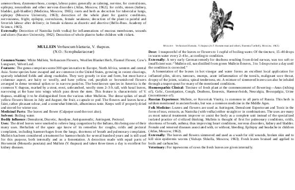 amenorrhoea, dysmenorrhoea, cramps, labour pains. generally as calming, nervine, for convulsions, epilepsy, neurasthnis and other nervous disorders( Atlas, Moscow, 1962); for colds, stones( kidney, bladder, gall-bladder)( Medicina, Moscow, 1965); roots and herb as decoction for tubercular lungs, epilepsy( Moscow University, 1963); decoction of the whole plant for gastric conditions, nervousness, fright, epilepsy, convulsions, female weakness; decoction of the plant in painful and feverish labour after delivery; in female sickness as diuretic and abortive( Bello-Russ. Academy of Science, 1965). Externally: Decoction of Nastoika( with vodka) for inflammations of mucous membranes, wounds and ulcers( Saratov University, 1962). Decoction of whole plant to bathe children with rickets.
