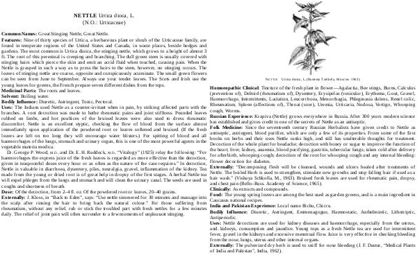 Common Names: Great Stinging Nettle, Great Nettle. Features: Nine of thirty species of Urtica, a herbaceous plant or shrub of the Urticaceae family, are found in temperate regions of the United States and Canada, in waste places, beside hedges and gardens. The most common is Urtica dioica, the stinging nettle, which grows to a height of almost 3 ft. The root of this pereninal is creeping and branching. The dull green stem is usually covered with stinging hairs which pierce the skin and emit an acrid fluid when touched, causing pain. When the Nettle is grasped in such a way as to press the hairs to the stem, however, no stinging occurs. The leaves of stinging nettle are coarse, opposite and conspicuously acuminate. The small green flowers can be seen from June to September. Always use your tender leaves. The Scots and Irish use the young leaves for greens, the French prepare seven different dishes from the tops. Medicinal Parts: The roots and leaves. Solvent: Boiling water. Bodily Influence: Diuretic, Astringent, Tonic, Pectoral. Uses: The Indians used Nettle as a counter-irritant when in pain, by striking affected parts with the branches. A root decoction was made to bathe rheumatic pains and joint stiffness. Pounded leaves rubbed on limbs, and hot poultices of the bruised leaves were also used to dress rheumatic discomfort. Nettle is an excellent styptic, checking the flow of blood from the surface almost immediately upon application of the powdered root or leaves softened and bruised.( If the fresh leaves are left on too long they will encourage water blisters.) For spitting of blood and all haemorrhages of the lungs, stomach and urinary organ, this is one of the most powerful agents in the vegetable materia medica.