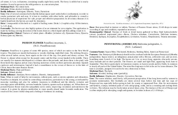 Common Names: Squaw Mint, Thickweed, Hedeoma, Stinking Balm, American Pennyroyal. Features: Our Pennyroyal( Hedeoma) should not be confused with the European Pennyroyal( Mentha pulegioides). Squaw mint is an indigenous annual plant with a fibrous, yellowish root, and an erect, branching stem, from 6 – 12 in. high. The leaves are ½ in. or more long, opposite, obscurely serrate, hairy beneath and on short petioles. The flowers are small and light blue, appearing from June to September. They thrive particularly in limestone country, in barren woods and dry fields. Is common to nearly all parts of the United States. The mint-like fragrance is felt in the air for some distance. The taste is aromatic, pungent. It is said to be very obnoxious to fleas. Medicinal Part: The herb. Solvents: Alcohol, boiling water( partially). Bodily Influence: Diaphoretic, Diuretic, Corrective, Nervine. Uses: The warm infusion, used freely, will promote perspiration. It has long been used by women to promote menstruation. Hot footbaths are taken several days before due date and two cups of Pennyroyal tea, especially before going to bed, for scanty or suppressed flow. Also for nervousness and hysteria, cramps, intestinal pains of colic and griping, colds, and as a sweating and cooling drink in fevers. The infusion may be freely taken several times a day. The tincture of the oil of Pennyroyal is often employed in whooping cough and spasms, to be taken in doses of 2 – 10 drops.