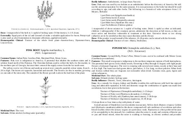 Bodily Influence: Anthelmintic, in large doses Narcotic. Uses: Pink root was used by our Indians as an anthelmintic before the discovery of America. We still use the ancient preparation for the same purpose. It is non-poisonous to the body but should be used according to age, and with other herbs. The following is a formula of wide acceptance from J. E. Meyers, Herbalist